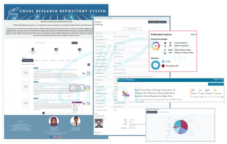 Integration to ORCiD, Highlights of Research Publication Visibility with metrics citation from other research publication platform such as SCOPUS, WoS, Altmetrics, Dimension, PlumX, Mendeley, etc making each paper, project or researcher more exciting and accountable with statistics to be viewed and downloaded for assessments.